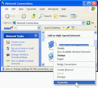 2.Click the local area network (LAN) connection or click the dial-up networking connection that you want to share (that is, the one that connects to the Internet), and then under Network Tasks, click Change settings of this connection.